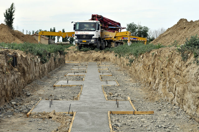 130團新疆錦善農機裝備基地建設項目工地上,一輛混凝土泵車(chē)剛剛澆筑完柱基混凝土墊層