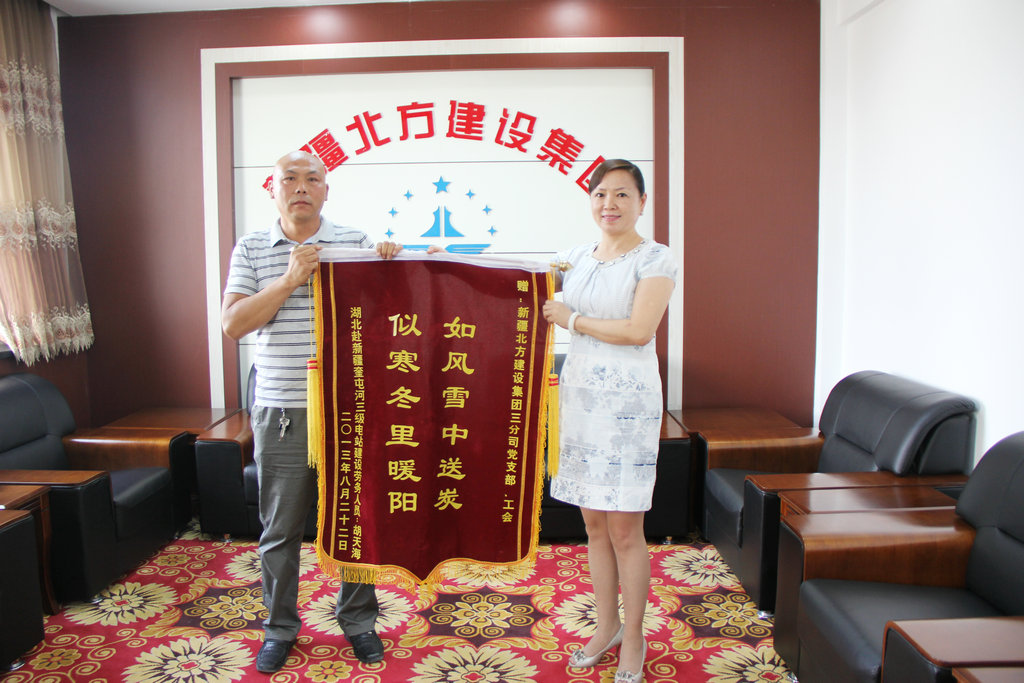 受胡天海所托,劉福勝拿著(zhù)從湖北寄來(lái)的感謝錦旗專(zhuān)門(mén)送到北方集團工會(huì )主席的手中。他說(shuō):“胡天海讓我一定把他的心里話(huà)帶到,感謝北方集團幫助他解決欠薪,在北方集團干活,我們放心!”