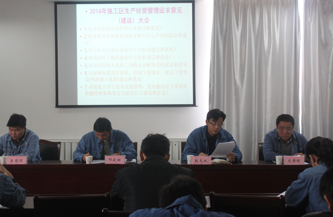 針對即將來(lái)臨的2014年生產(chǎn)經(jīng)營(yíng)管理工作,趙先斌主任為大家分析預測2014年生產(chǎn)經(jīng)營(yíng)管理模式及工作思路,引導發(fā)揮集體智慧,共同為2014年生產(chǎn)經(jīng)營(yíng)管理出謀劃策,獻計納言。工區總支從項目管理、績(jì)效考核、項目班子的組建、項目管技人員工資收入分配形式及如何提高大學(xué)生技術(shù)員管理等方面廣泛征求管技人員意見(jiàn)和建議,發(fā)放民主測評表、民主推薦表和生產(chǎn)經(jīng)營(yíng)管理征求意見(jiàn)表各51份。